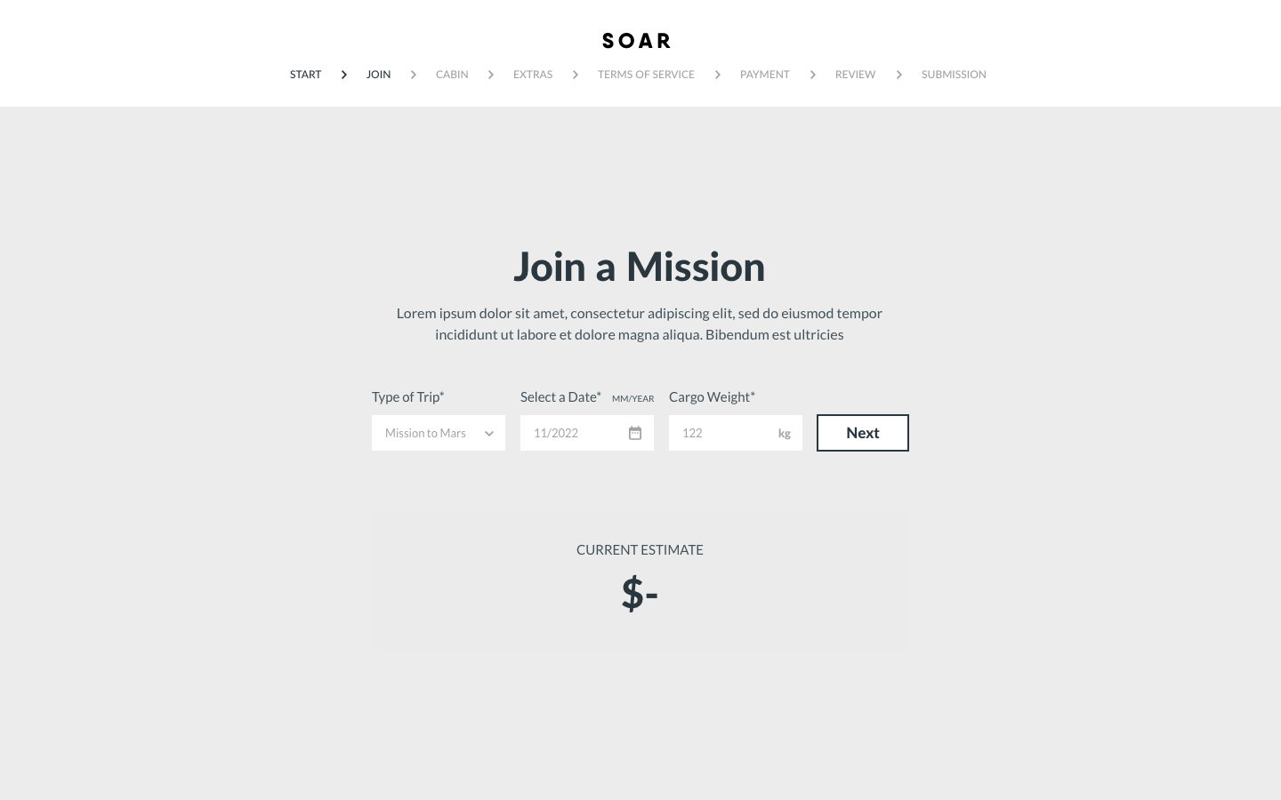 "Start a Mission" is the primary call-to-action. The plan is to have it accessible in the navigation, so it's available at all times.