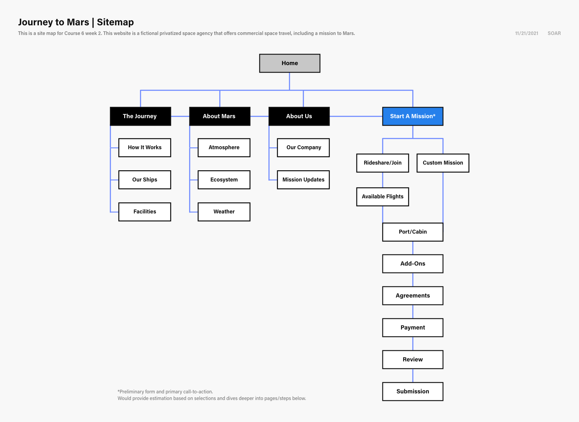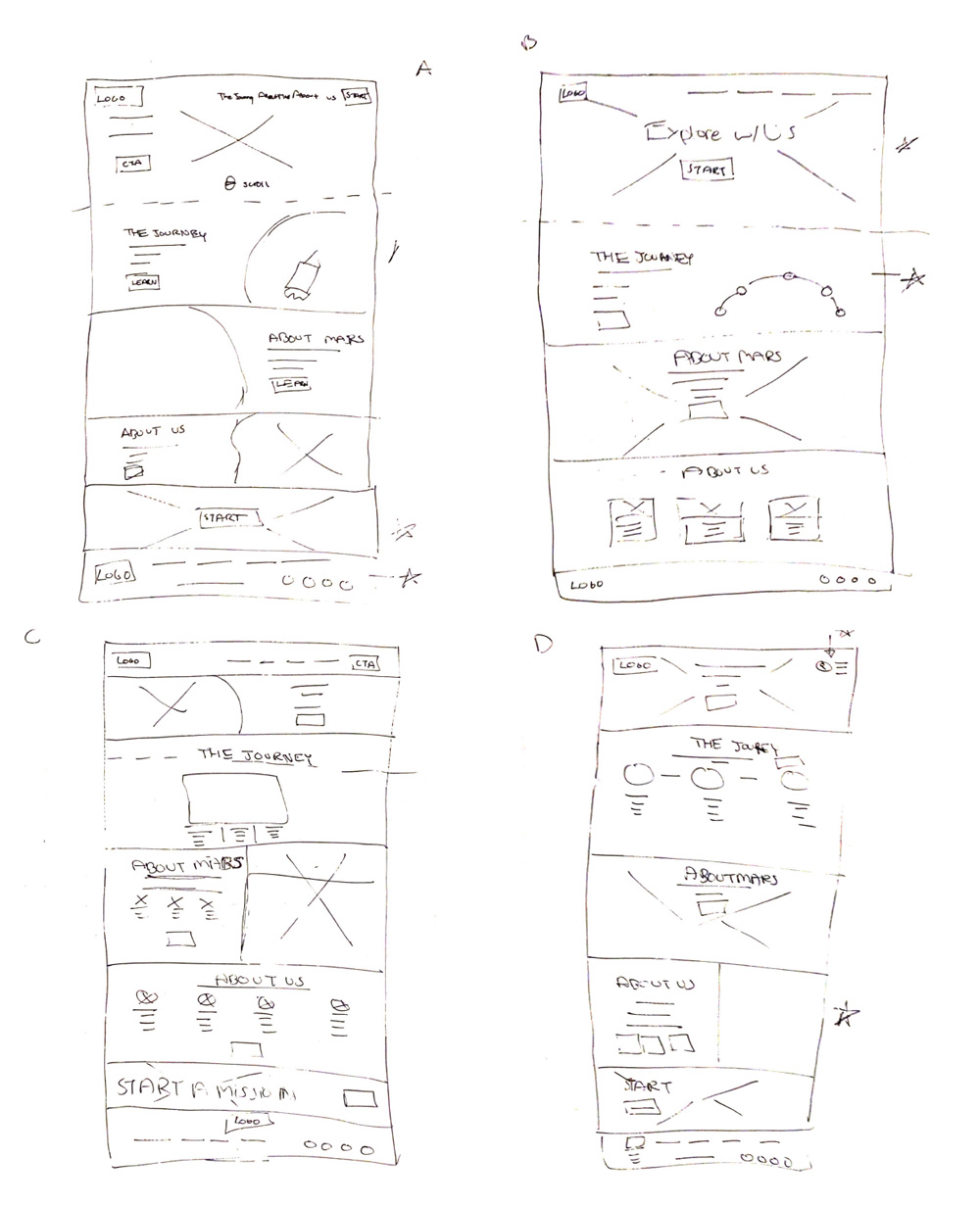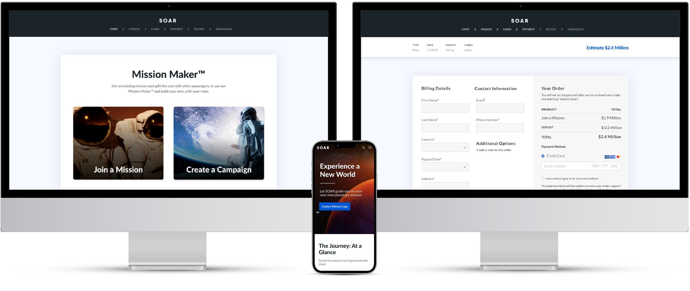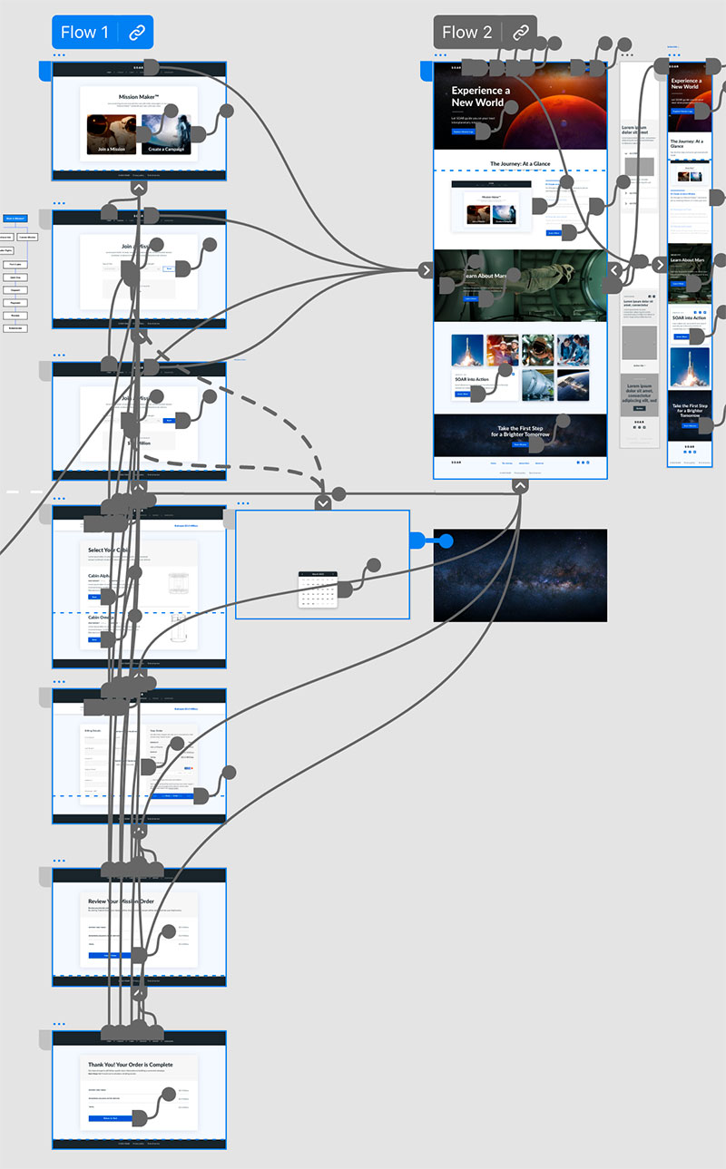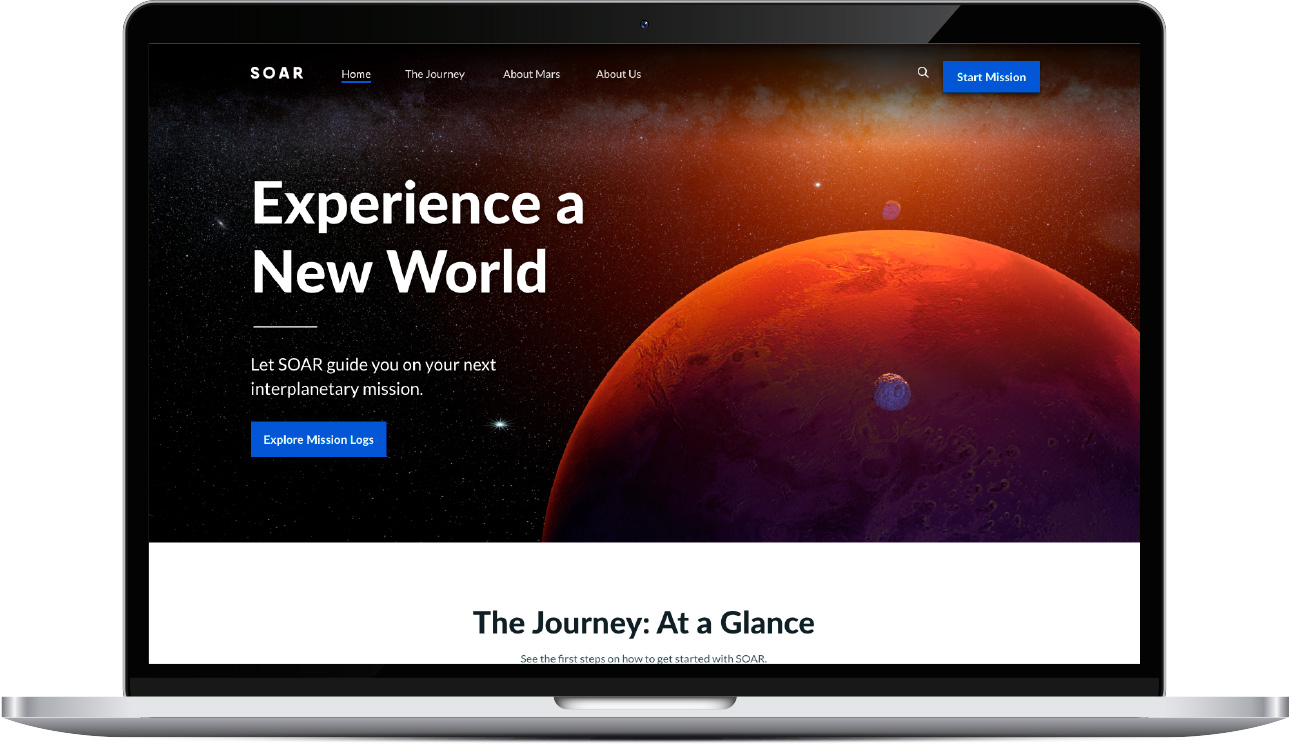 This website is a fictional privatized space agency that offers commercial space travel, including a mission to Mars. The primary call to action leads to the main user flow, Mission Maker.
