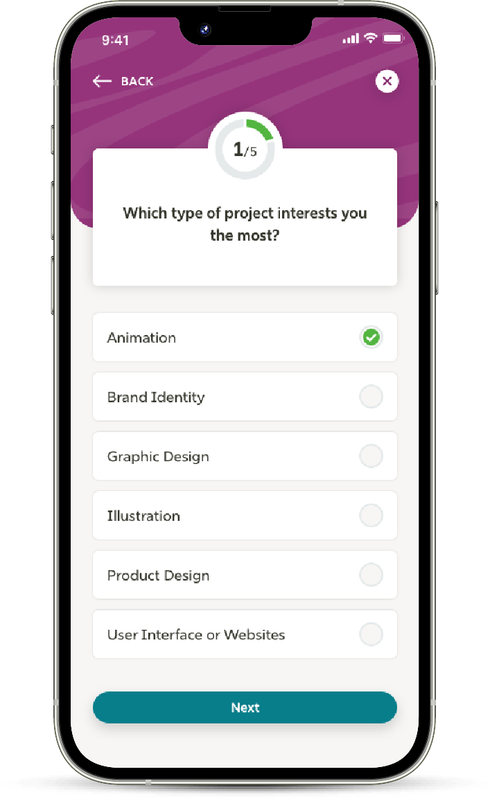 Early designs lacked a progress indicator, and the Next CTA now gives users a confirmation of their selection, requiring to tap it to move onto the next question. CTA was also made sure to have an ideal contrast ratio for accessibility and legibility.