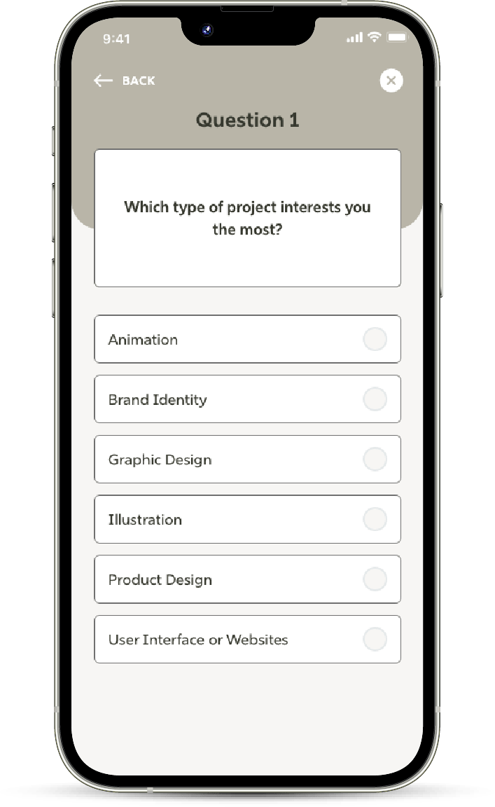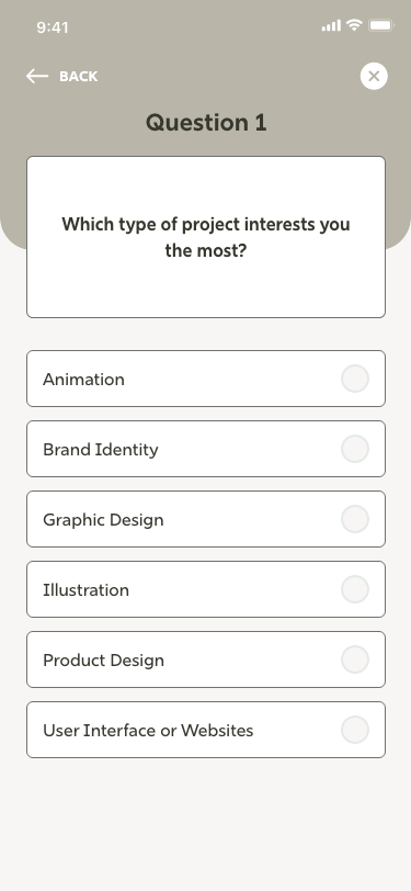 This is the initial low-fi version of the assessment, the primary user flow of the app. This helps designers reflect and identify what they may enjoy or specialize in, and even determine an ideal work environment/setting. Users can navigate forward, backward, and quit the process. Additionally, the radio selection ensures only one selection can be made at a time.