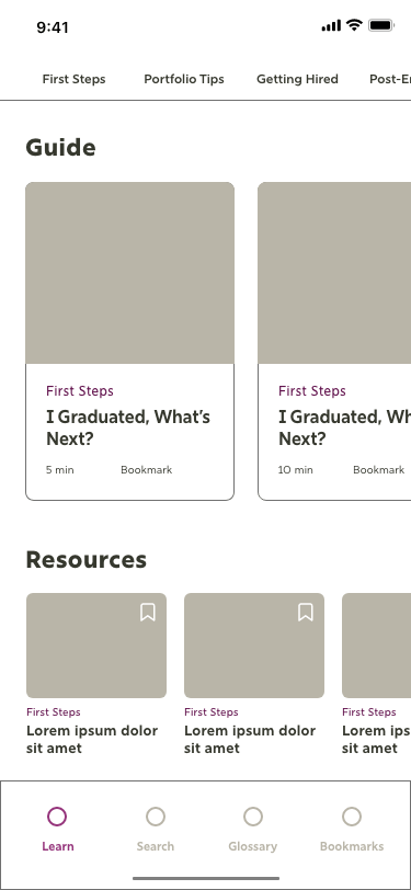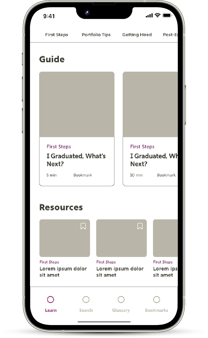 I conducted moderated and unmoderated interviews and created empathy maps to understand the users I’m designing for and their needs. A primary user group identified through research are young adults and students who don’t know where to start after graduating.